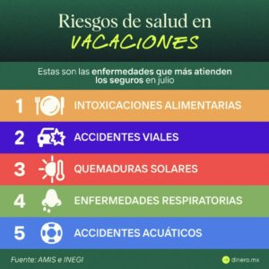 Riesgos de salud en verano: Estas son las 5 enfermedades que más atienden los seguros en julio Actualidad por Redacción - julio 15, 20250 Con la llegada de las vacaciones de verano, miles de familias viajan para disfrutar de playas, pueblos mágicos o visitar familiares y amigos en distintas partes del país. Sin embargo, según datos oficiales, esta temporada también es una de las más propensas a registrar accidentes y enfermedades, lo que incrementa considerablemente la demanda de atención médica y el uso de los seguros. Alejandro Sena, director general de Dinero.mx señala que: «en vacaciones, los seguros médicos reportan un notable incremento en consultas y emergencias relacionadas principalmente con accidentes y problemas gastrointestinales derivados del cambio en hábitos alimenticios o condiciones higiénicas diferentes a las del hogar». Durante julio, se registra un repunte considerable en ciertas enfermedades que requieren atención médica inmediata. Entre las más comunes, de acuerdo al análisis de Dinero.mx, destacan: 1. Intoxicaciones o malestar gastrointestinal Las intoxicaciones por alimentos encabezan la lista, con un 30% del total de casos reportados en julio de 2024 según la AMIS. Estos casos generalmente ocurren por el consumo de alimentos en mal estado o por mala higiene en restaurantes o puestos callejeros. También se debe de considerar que muchos vacacionistas interrumpen su dieta habitual, ocasionando desequilibrio donde las personas tienden a enfermarse. 2. Accidentes viales En el 2023, México registró 381,048 accidentes de tránsito en zonas, la cifra más alta desde 2016, lo que representa un aumento del 1.01 % al año pasado. Algunas de las razones, son: el exceso de velocidad, el uso del celular o manejar bajo la influencia del alcohol, sustancias ilegales o cansado. 3. Quemaduras solares Las quemaduras por el sol, deshidratación y golpes de calor, llegan a representar un 15% de las atenciones médicas en julio. Muchos turistas subestiman la exposición prolongada al sol, el uso del bloqueador solar y la hidratación constante. Dando como resultado lesiones moderadas hasta graves, que claramente requieren atención médica. 4. Enfermedades respiratorias Las enfermedades respiratorias en vacaciones son más comunes de lo que creemos, aunque pueda parecer extraño, el aire acondicionado, los cambios bruscos de temperatura e incluso el simple hecho de relajarte pueden desencadenar resfriados, alergias, faringitis, sinusitis. 5. Accidentes en playas y albercas Los accidentes en playas, ríos y albercas son una preocupación constante, especialmente durante las vacaciones y las temporadas de calor. Los ahogamientos son la principal causa de muerte accidental y desgraciadamente con un alto porcentaje con menores de edad. Por otra parte, los accidentes por caídas al lanzarse de alturas demasiado altas, traen como consecuencias fracturas en distintas partes del cuerpo. Importancia de contar con un seguro médico Ante estas estadísticas, Dinero.mx recomienda contar con un seguro médico vigente. Aunque muchos turistas mexicanos que viajan al extranjero, han regresado sin ningún mayor percance, se recomienda contratar un seguro de viaje para tener mayor seguridad ante cualquier imprevisto. Alejandro Sena, director general de Dinero.mx, asegura «Las emergencias médicas fuera del lugar habitual de residencia suelen ser más costosas. Un seguro adecuado cubre no solo la atención inmediata, sino también hospitalizaciones y traslados que pueden representar gastos muy altos». Compartir en Facebook Compartir Compartir en TwitterTweet Compartir en Pinterest Compartir Compartir en Linkedin Compartir Compartir en Digg Compartir