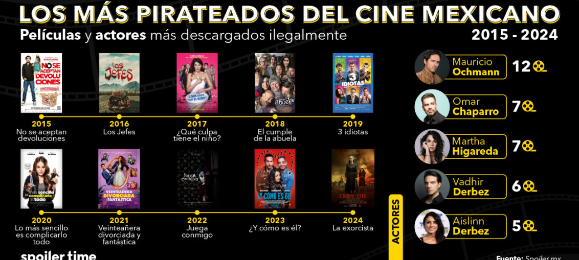 En México, durante el análisis de Spoiler , se encontraron datos de CANACINE que muestran tendencias interesantes. Igual que Interestelar, que un año después de su estreno seguía siendo muy buscada en sitios ilegales, No se Aceptan Devoluciones, ópera prima de Eugenio Derbez, fue la más pirateada de 2015. Y el legado familiar no se quedó ahí: Aislinn y Vadhir Derbez también figuran en el top de la década, con Vadhir destacando por aparecer dos veces entre las más pirateadas, gracias a Veinteañera, Divorciada y Fantástica y 3 Idiotas, donde compartió créditos con Martha Higareda.