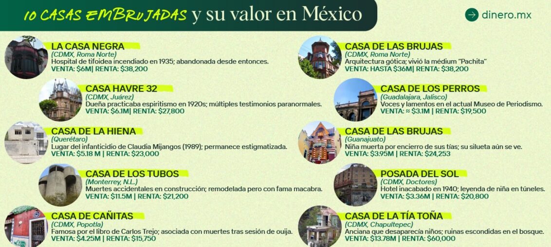 Casas embrujadas en México: Esto cuesta vivir en ellas Actualidad Inmobiliario por Vicente Anguiano Redacción - octubre 6, 2025octubre 6, 20250 Las ciudades mexicanas están llenas de leyendas urbanas sobre casas embrujadas, donde se relatan sucesos paranormales que generan tanto fascinación como misterio. Más allá de la narrativa, surge la duda ¿cuánto cuesta vivir cerca de estas propiedades? Alejandro Sena, director general de Dinero.mx, asegura que “los datos muestran que muchas de estas casas se localizan en colonias históricas, donde el valor inmobiliario supera el promedio nacional. De acuerdo con la Sociedad Hipotecaria Federal, al primer trimestre de 2025 el precio promedio de la vivienda en México rondaba los 1.86 millones de pesos, con un incremento anual de 8.4% en la primera mitad del año.” A continuación, la plataforma de finanzas Dinero.mx, comparte el ranking de las 10 casas embrujadas más conocidas y el costo promedio de venta o renta de cada una: La casa negra, Ciudad de México Ubicada en la colonia Roma Norte, Alcaldía Cuauhtémoc, CDMX. Esta casona se hizo célebre porque a inicios del siglo XX funcionó como hospital para enfermos de tifoidea. En 1935 un incendio, atribuido a vecinos que temían contagios, consumió el lugar con pacientes dentro. Desde entonces, la casa permanece abandonada y en ruinas. Precio: $74,127 pesos/m². Un departamento de 100 m² supera los 6 millones de pesos. La renta mensual se ubica en $38,200 pesos en promedio o $447.88 pesos/m². Casa de las brujas, Ciudad de México Se localiza en la colonia Roma Norte, Alcaldía Cuauhtémoc, CDMX. Este edificio destaca por su arquitectura gótica, que recuerda un sombrero de bruja. En los años sesenta vivió allí la médium Bárbara Guerrero, “Pachita”, famosa por supuestas cirugías espirituales. Vecinos y visitantes han reportado lamentos y luces encendidas sin explicación. Precio: Venta promedio de 6.3 millones de pesos, con propiedades que alcanzan hasta 36 millones. En rentas, los valores rondan los $38,200 pesos mensuales o $447.88 pesos/m². Casa Havre 32, Ciudad de México Ubicada en Calle Havre 32, colonia Juárez, Alcaldía Cuauhtémoc, CDMX. En la década de 1920 perteneció a una mujer aficionada al espiritismo, quien organizaba sesiones de ouija. Con el tiempo, surgieron rumores de voces, gritos y apariciones. Precio: Promedio de $81,760 pesos/m², con viviendas en torno a los 6.1 millones de pesos. Las rentas en esta colonia alcanzan los $27,800 pesos, o los $456.58 pesos/m². La casa de los perros, Guadalajara, Jalisco Se encuentra en Av. Fray Antonio Alcalde 225, Zona Centro, Guadalajara. Hoy es el Museo del Periodismo y las Artes Gráficas. Fue propiedad de Don Jesús Flores y su esposa, quienes prometieron rezar novenarios mutuos. Tras la muerte de él, la viuda incumplió y pronto se casó de nuevo. Desde entonces se escuchan rezos, voces y lamentos en el interior. Precio: $39,600 pesos/m². Un departamento ronda 3.1 millones. El alquiler promedio se estima en $19,500 pesos mensuales. La casa de las brujas, Guanajuato, Gto. Ubicada en en el Barrio de la Presa, Guanajuato capital. Según la leyenda, dos hermanas cuidaban de su sobrina Susana, pero la maltrataban cruelmente hasta que murió de hambre en el sótano de la casa. Vecinos dicen ver la silueta de una niña en ventanas y corredores. Precio: $18,500 pesos/m², con un valor medio de 3.95 millones de pesos por vivienda. Las rentas llegan a un promedio de $24,253 pesos mensuales o $105 pesos/m². La casa de la hiena, Querétaro, Qro. Con domicilio en Col. Jardines de la Hacienda, Querétaro, ocurrió en 1989 el infanticidio cometido por Claudia Mijangos. La casa quedó abandonada y se habla de gritos, pasos y la figura de un niño en la ventana. Su estigma persiste más de tres décadas después. Precio: $23,014 pesos/m² y un valor promedio de 5.18 millones de pesos por casa. El mercado de renta muestra precios de alrededor de $23,000 pesos al mes o $117 pesos/m². La casa de los tubos, Monterrey, Nuevo León Ubicada en colonia Contry la Silla, Monterrey. Construida en los años 70 con un diseño tubular, su construcción se detuvo tras muertes accidentales de obreros y la muerte de la hija del dueño en silla de ruedas, lo que dio origen a relatos de ruidos, sombras y presencias. Precio: $27,250 pesos/m², con valor promedio de 11.5 millones por casa. En renta, los inmuebles se ofrecen desde $14,000 hasta $50,000 pesos, con un promedio de $21,200 pesos mensuales. La posada del sol, Ciudad de México Con domicilio en la colonia Doctores, Cuauhtémoc, CDMX. Este hotel de los años 40 nunca se consolidó y quedó en abandono. La leyenda dice que en sus túneles se escuchan voces, lamentos y la aparición de una niña. Precio: $49,484 pesos/m² y un valor medio de 3.36 millones de pesos. Las rentas habituales en la colonia Doctores se sitúan en $20,800 pesos mensuales o $338 pesos/m². La Casa de Cañitas, Ciudad de México Se encuentra en Calle Cañitas 51, colonia Popotla, Miguel Hidalgo, CDMX. Saltó a la fama en los años 90 con el libro Cañitas de Carlos Trejo, que relataba sucesos paranormales tras una sesión de ouija. Precio: $40,639 pesos/m², con un valor medio de 4.25 millones de pesos. En arrendamiento, el promedio es de $15,750 pesos al mes, con un costo de $262 pesos/m², según datos estimados de Dinero.mx La Casa de la Tía Toña, Ciudad de México Ubicada en la tercera sección del Bosque de Chapultepec, Miguel Hidalgo, CDMX. Cuenta la leyenda que una anciana conocida como “Tía Toña” acogía a niños de la calle, pero un día los asesinó. Desde entonces, quienes entran aseguran escuchar gritos y pasos. Precio: En Lomas de Chapultepec, el valor medio de vivienda es de 13.78 millones de pesos, con un promedio de 64,816 pesos/m². El alquiler en esta zona alcanza en promedio los $60,000 pesos mensuales o $229 pesos/m². “El precio de salida de casas con reputación paranormal —y